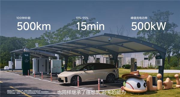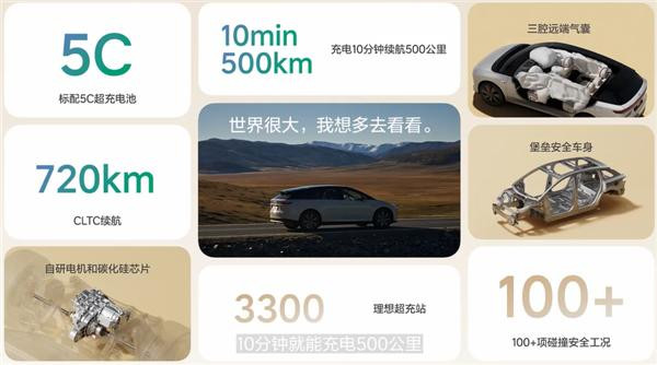 该车全系标配5C磷酸铁锂电池,容量为87.3度,后驱版CLTC续航里程720公里,且采用800V高压系统,支持超快充,充电10分钟续航500公里,配合理想成熟的补能网络,实现用车无忧。