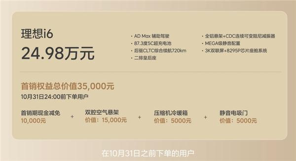 快科技9月26日消息,刚刚,全新理想i6上市,共推出1款车型,售价区间24.98万元,首销期直减1万元,限时仅23.98万,同时官方还公布了上市权益,限时赠送双腔空悬、压缩机冷暖箱和四静音电吸门。